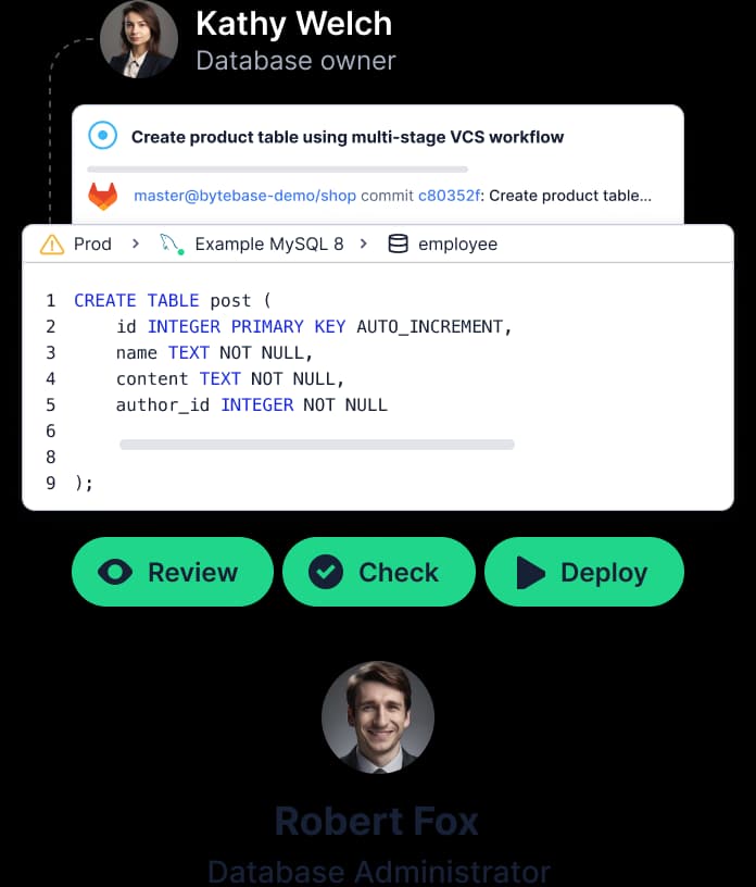 Learn moreBytebase streamlines database change deployment from non-prod to prod with review workflow, rollback, and optional GitOps integration.